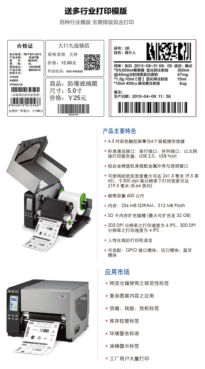 TSC有30多個系列,近百個機(jī)型的專業(yè)條形碼打印產(chǎn)品,種類涉及桌面型、工業(yè)型、便攜型、列印模組以及彩色打印,是目前所有品牌中產(chǎn)品較為齊全的制造廠商,可滿足各種行業(yè)的使用需求。